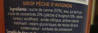 Ingredients: sucre de canne (57%), eau, jus de fruits base de concentrés 21% (pêche dtAvignon 10% pêche. sureau), acidifiant : acide citrique, arôme naturel, stabilisant : estefs glycériques de résine de bois, conservateur : sorbate de potassium,