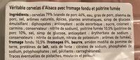 Ingredients: cervelas 79 % (viande de porc 46 %, eau, gras de porc, plasma de porc, sel, arômes naturels, épices, plantes aromatiques, sirop de glucose, émulsifiant : diphosphates ; antioxydant : acide ascorbique ; sucre, colorant : carmins ; conservateur : nitrite de sodium), poitrine fumée 10,5 % (poitrine de porc 10 %, sel, sirop de glucose, antioxydant : érythorbate de sodium , conservateurs : nitrite de sodium, nitrate de potassium ; arômes de fumée), fromage fondu 10,5 % (fromages 8 %, beurre, amidon modifié de pomme de terre, protéines de lait, sels de fonte : citrates de sodium, phosphates de sodium, polyphosphates ; sel, gélifiants : carraghénanes).