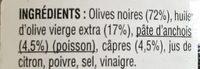 Ingredients: Olives noires (72%), huile d'olive vierge extra (17%), pâte d'anchois (4,5%) (poisson), câpres (4,5%), jus de citron, poivre, sel, vinaigre.