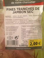 Ingredients: de notre charcutier FINES TRANCHES DE JAMBON SEC . Jambon de porc (origine : Union Européenne) Ingrédients conservateur : nitrate de potassium. Conservation : À conserver entre OOC et +80C. À consommer jusqu'au / L : Numéro de lot / Date de mise au Semaine.Année) : voir sur l'emballage. Conditionné sous protectrice. À consommer rapidement après ouverture.