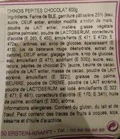 Ingredients: CHINOIS PEPITES CHOCOLAT 600g Ingtédients: Farine de BLE, garniture pâti ssière 25% [eau, sucre, OEUF entier, amidon modifié. amidon de maïs, i poudre de LAIT entier, matière grasse végétale (palme,palmiste), poudre de LACTOSERUM, correcteurs I d'acidité (E 263; E 450), émulsifiants (E 471: E 472b; E 472e), arômes, sel, sirop de glucose, épaississant (E 415), jus de betterave rouge déshydraté, extrait de carotte], OEUF entier, glaçage [sucre, s rop de glucose, eau, émulsifiant (E 471), acidifiant (E 330)1) sucre, eau, levure, pépites de chocolat 2% [sucre, kteurre de cacao, poudre de LAIT entier, masse de cacao, poudre de LAIT écrérné, émulsifiant (E 322)), graisse de palme, BEURRE, poudre de CREME, poudre ce IAT écrémé, poudre de LACTOSERUM, sel iodé, émulsifiants (E 322: E 471; E 481), correcteurs d'acidité (E 1 E 341), huile de palme, acidifiant (E 330)