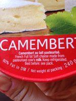 Ingredients: CAMEMBER Camembert au lait pasteurisé. French Full fat Soft cheese made from 600 pasteurised cow's milk.keep refrigerated. Best before: see pack. in DM / Net weight •