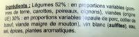 Ingredients: Légumes 52 % : en proportions variables (pommes de terre, carottes, poireaux, oignons), viandes (origine UE) 30 %: en proportions variables ,épaule de porc,collier de bœuf, viande maigre de mouton), vin blanc (sulfites), eau viande maigre de mouton), vin blanc (sulfites) eau sel, épices, plantes aromatiques.