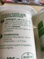 Ingredients: Lait entier Bio 87%, sucre de canne Bio 9.4%, lait écrémé en poudre Bio, arôme naturel de vanille, ferments lactiques.