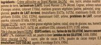 Ingredients: Crème pâtissière au Grand Marnier (64,5%) : eau, sucre, amidon modifié pomme de terre, lactosérum (LAIT), Grand Marnier 2,3% (Alcool, Cognac, arômes naturE d'oranges amères, colorant E150a), matières grasses végétales (palme, palmiste), sirop glucose, poudre de LAIT écrémé, émulsifiants (E472a, E472b), stabilisants (E450, E51 gélifiants (E450iii, E263, E339ii), épaississant E401, arôme, protéines de LAIT, curcuma paprika, colorants (E160a, E101), sel. Glacage : sucre, matière grasse végétale (palme, colza), sirop de lucose, eau, humect émulsifiants E473), sel, acidifiant E334, colorants (E171 , E120, arômes. Pâte à chou pur beurre (10,8%) : ŒUFS entiers, eau, farine de blé (GLUTEN), beurre concent (LAIT) 1,2%, stabilisant E420, sel, poudre à lever (amidon de blé (GLUTEN), E450i, E500ii). Décor chocolat (3,2%) : sucre, pâte de cacao 0,9%, poudre de cacao maigre 0,3%, émulsifiant E322 (SOJA), agents d'enrobage (E414, E904).