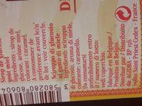 Ingredients: di glucosio, arortta di riliele, colorante: cararnello. Da consutuarsi A preferibilrnente entro il / nutttero di lotto: vedi coperchio. Fabriqué en Belgiques/ Prodotto in Belgio. Distribué par / Distribuito da: - BP 156 69801 Saint Priest Cedex - France I