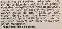 Ingredients: du bouillon déshydraté : sel de mer, amidon de maïs*, huile de palme* équitable non hydrogénée, sirop de glucose* , viande de boeuf en poudre* 4%, sucre de canne*, graisse de bœuf* 2,3%, tomate* , oignon grillé*, extrait de levure', sucre caramélisé*, épices* 0,5% (poivre', noix de muscade*, piment*), ail* , feuille de livèche*, persil* , marjolaine*. Traces possibles de céleri.