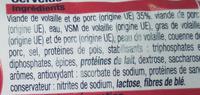 Ingredients: Viande de volaille et de porc (origine UE) 35%, viande de porc (origine UE), eau, VSM de volaille (origine UE), gras de volaille (origine UE) et de porc (origine UE), peau de volaille, couenne de porc, sel, protéines de pois, stabilisants : triphosphates et diphosphates, épices, protéines de lait, dextrose, saccharose, arômes, antioxydant : ascorbate de sodium, protéines de sang, conservateur : nitrite de sodium, lactose, fibre de blé.