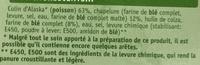 Ingredients: Colin d'Alaska (poisson) 63 %, chapelure (farine de blé complet, levure, sel, eau, farine de blé complet malté) 12 %, huile de colza, farine de blé complet (8 %), eau, sel, levure chimique (stabilisant : E450, poudre à lever : E500, amidon de blé).