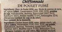 Ingredients: Blanc de Poulet (80%), eau, fécule de pomme de terre, sel, épices (céleri), Conservateurs: E326, E262, E250, rotéine de sola, maltodextrine, dextrose Epaississant: E407, ?410, Stabifisant: E451 i, Amidon modifié: El 442, Antioxygène: E316. Allergènes: Contient du soja et du céleri. Peut contenir de la moutarde, Ingredients: Chicken breast (8096), water, otato starch, salt, spices (celer), Preservatives: E326, E262, ?250, so rotein, maltodextrin, dextrose, Thickenin aqents: E407, !4P10 Stabiliser: E451 i, Modified starch: Pl 442, Antioxidant: à 16. Allerqens: Contains soy and celery. May contain mustard.
