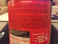 Ingredients: en pou Saveur Brownie gluten energétique et facile a consommer, SPORDEJ sans entfiinement en pleine possession de ses moyens, Idéal pour du déjeuner ou en fin de Journée. Se consomme idéalement juste avant 120 g- 3 à 6 mesures, Ajouter de reau froide en remuantjusqu'à ni liquide, ni compact. Astuce, associéauREGEPR0r protéines qui contribuent à maintenir la masse musculaire), SPORDE$ sans gluten en récupération. : maltodextrines, protéines de soja (émulsifiant : lécithines (soja}), pomme de terre modifiée, poudre de cacao 10%, copeaux de chocolat de cacao, sucre, beurre de cacao, matière grasse du lait, émulsifiant (soja), arôme naturel de vanille), fructose, noix de pécan caramélisées noixde écan 63%, sucre, sucre glace (antiagglomérant : dioxyde de silicium) age: Omme arabique, sirop de sucre caramélisé), dextrose, arômes trica cique, correcteurs d'acidité : carbonates de magnésium et df BI (thiamine). Fabriqué dans un atelier qui utilise : autres fruits a céleri, sulfites. Conformément à la réglementation ce produit contient 20 rng/kg de gluten.