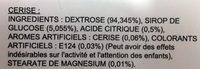 Ingredients: DEXTROSE (94,345%), SIROP DE GLUCOSE (5,055%), ACIDE CITRIQUE (0,5%), ARÔMES ARTIFICIELS : CERISE (0,06%), COLORANTS ARTIFICIELS : E124 (0,03%) (Peut avoir des effets indésirables sur l'activité et l'attention des enfants), STÉARATE DE MAGNÉSIUM (0,01%).