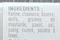 Ingredients: Farine, chaource (lait), beurre, oeufs, graines de moutarde, pavot, sel, curry, cumin, poudre à lever.