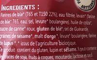 Ingredients: Farines de blé* (165 et T150 22%), eau filtrée, levain* (farine de blé* T65, eau, sel levure* boulangère), huile de colza*, sucre de canne* roux, gluten de blé, sel de Guérande, graines de sésame*, malt d'orge*, levure* boulangère, farine de lupin*. * issus de I'agriculture biologique