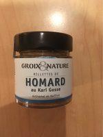 Ingredients: Homard* (30,5%), crème liquide, lieu, Noix de Saint-Jacques, échalotes, carottes, beurre, farine de blé, protéines de lait et lactose, sel, persil, ail, kari gosse (0,05%) (gingembre, girofle. curcuma, piment, cannelle, poivre).