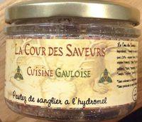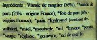Ingredients: Viande de sanglier (56 %), viande de porc (26 % - origine France), foie de porc (6 % - origine France), pain (gluten), hydromel (contient des sulfites), miel, moutarde, ail, hysope, poivre, sauge, réglisse, genièvre, sel de mer fin.