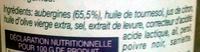 Ingredients: Aubergines (65,5 %), huile de tournesol, jus de citron, huile d'olive vierge extra, sel, extrait de levure, correcteur d'acidité : acide lactique, ail, persil, poivre noir, sarriette.