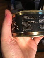 Ingredients: Viande de canard. graisse de canard, sel, poivre, sucre, thym. Valeurs nutritionnelles pour 100g 1334 kj / 321,4 kcal Lipides: 25.8g dont AGS: 8.2g Glucides.' g dont sucres : 0.3g Protéines: 22 g Sel: 2.3g