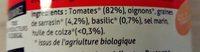 Ingredients: Tomates (82%), oignons, graines de sarrasin (4,2%), basilic (0,7%), sel marin, huile de colza (<0,3%).