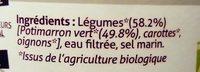 Ingredients: légumes* (58.2%) (potimaron vert* (49.8%),carottes *, oignons*), eau filtrée, sel marin. *Issus de l'agriculture biologique