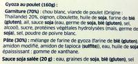 Ingredients: Gyoza au poulet (160g) : Garniture (70 %) : chou blanc, viande de poulet (Origine : Thaïlande) 20 %, oignon, ciboulette, huile de soja, farine de blé (gluten), ail, sauce soja (eau, germe de soja, blé (gluten), sel, alcool), sucre, protéines végétales hydrolysées (maïs, germe de soja), sel, poudre de poivre blanc. Pâte (30 %) : mélange de farine de gyoza (farine de blé (gluten), amidon modifié, amidon de tapioca (sulfite)), eau, huile de soja, épaississant : gomme de xanthane. Sauce soja salée (20 g) : eau, graines de soja, blé (gluten), sel