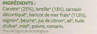Ingredients: Carotte* (25%), lentille* (13%), sarrasin décortiqué*, haricot de mer frais* (11,5%), oignon*, beurre*, jus de citron*, ail*, huile d'olive vierge extra*, miel*, poivre*, romarin* *issu de l'agriculture biologique