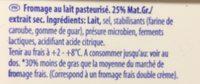 Ingredients: lait, sel, (farine de caroube, gomme de guar), présure microbien. ferments lectiques, acidifiant acide citrique. Tenir au frais à +2 - A consommer jusqu/au: nir au dos '3E moins de gras que la mopnne du marché de frais. (Correspond à un fromage frais double crème).