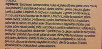 Ingredients: Saccharose, dextine-maltose, huiles végétales raffinées (palme, colza, de coco, tournesol), L-aspartate de L-lysine, L-alanine, amidon, L-proline, L-leucine, glycine, L-sérine, L-valine, L-aspaflate de magnésium, L-isoleucine, L-tyrosine, poudre de cacao (l .8%), L-arginine, odhophosphate de calcium, L-thréonine, citrate de potassium, arôme naturel (cacao), L-histidine, L-méthionine, L-cystine, bitartrate de choline, L-tryptophane, carbonate de calcium, émulsifiant (ester citrique de mono et digtycérides dacides gras), inositol, arôme naturel (vanille), acide L-ascorbique, L?camitine, sulfate ferreux, sulfate de inc, acétate de DL-a tocophérol, niacinamide, D-pantothénate de calcium, sulfate de manganèse, antioxydant (palmitate dascorbyle), sulfate de cuivre, chlorhydrate de pyridoxine, mononitate de thiamine, riboflavine, acétate de rétinol, acide ptéroylmonogtutamique, iodure de potassium, chlorure de chrome, molybdate de sodium, sélénite de sodium, D-bioüne, phytoménadlone, cholécalciférol, cyanocobalamine.