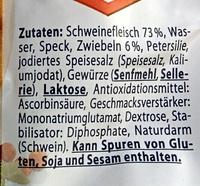 Ingredients: Schweinefleisch 73%, Wasse, Speck, Zwiebeln 6%, Petersilie, jodiertes Speisesalz (Speisesalz, Kaliumjodat), Gewürze (Senfmehl, Sellerie), Laktose, Antioxidationsmittel: Mononatriumglutatmat, Ascorbinsäure,Geschmacksverstärker: Mononatriumglutamat, Dextrose, Stabilisator: Diphosphate, Naturdarm (Schwein)