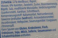 Ingredients: Weißkraut 51%, Rapsol, Wasser, Karotten 6%, Zwiebeln, Zucker, Branntweinessig, Eigelb, Salz, modifizierte Maisstärke, Verdickungsmittel: Guarkernmehl, Xanthan; Schnittlauch, Konservierungsstoff: Kaliumsorbat, Natriumbenzoat Gewürze (enthalten Senfmehl), Antioxidationsmittel: Ascorbinsäure; Hefepulver, Säuerungsmittel: Essigsäure; Zitronensaft.