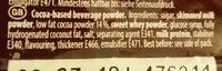 Ingredients: GB Cocoa•basedbeveragepowdet$ powder, tow fat powder t4%t sweet whey powdert glucose hydrogenated coconut fat, saltt separating aqent 841, milk proteint 340, flavouring, thickener E466, emulsifier Best before: seeside