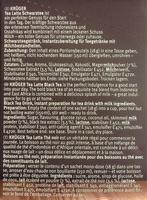 Ingredients: Zucker, Arome, Glukosesirup, Kokosöl, Magermilchpulver (7%), Schwarztee Extrakt (3,5%), Laktose, Stabilisator E452, Milcheiweiss, Stabilisator E340, Trennmittel E341, Emulgator E471, Emulgator E472e