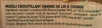 Ingredients: céréales* complètes 58% (flocons d'avoine* 36%, riz* 13,5%, farine de blé*), sucre de canne* complet, huile de tournesol* (tournesol*, antioxydant : extrait de romarin*), graines de courge* 6,3%, graines de lin* 5,6%, sirop de blé*, cannelle*. *Ingrédients issus de l'agriculture biologique. En gras : allergènes. Peut contenir des traces de lait, de soja et de à coques.