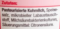 Ingredients: Pasteurisierte Kuhmilch, Speisesalz, mikrobieller Labaustauschstoff, Milchsäurebakterienkulturen, Säuerungsmittel: Citronensäure
