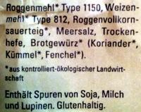 Ingredients: Roggenmehl Type 1150, Weizenmehl Type 812, Roggenvollkornsauerteig, Meersalz, Trockenhefe, Brotgewürz (Koriander, Kümmel, Fenchel)