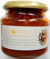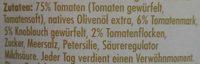 Ingredients: 75% Tomaten (Tomaten gewürfelt, Tomatensaft), natives Olivenöl extra, 6% Tomatenmark, 5% Knoblauch gewürfelt, 2% Tomatenflocken, Zucker, Meersalz, Petersilie, Säureregulator Milchsäure.