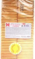 Ingredients: мука пшеничная, маргарин (рафинированные дезодорированные частично гидрогенизированные растительные масла, эмульгатор (моно и диглицериды жирных кислот), вода, пищевые красители (аннато, куркумин), используемый компонент с кодом A (эмульгатор (лецитин соевый)), используемые компоненты с кодом B (эмульгатор (лецитин соевый), антиокислители (аскорбиновая кислота, E307), используемый компонент с кодом C (эмульгатор (эфиры полиглицерина и жирных кислот)), сахар, отруби пшеничные, разрыхлители (соль углеаммонийная, сода пищевая), соль, регуляторы кислотности (молочная кислота, лимонная кислота), солодовый экстракт, эмульгатор (лецитин соевый), дрожжи сухие хлебопекарные, антиокислители (пиросульфит натрия, Новасол (аскорбиновая кислота, E307), ГМО 0%