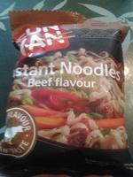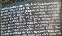 Ingredients: Nouilles (91%) : farine de blé, huile de palme, pomme de terr amidon modifié, sel, gluten de blé, agents élevateurs : carbonates de sodium et de potassium, poudre de curcuma. Bouillon (9%) : sel, arômes (contenant céleri), arômes et additifs E621, E627, E631, arômes, lactose, sauce de soja fermentée (soja, blé, maltodextrine, sel), viande de boeuf, carottes oignon vert, piment, poivre noir, acide ascorbique anti-oxydant, colorant E150c.