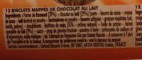 Ingredients: Farine de froment (39 %), chocolat au lait (29 %) [sucre, beurre de cacao, masse de cacao, lait écrémé en poudre, lactosérum en poudre, beurre pâtissier, graisses végétales (sel, karité, palme), émulsifiants : lécithine de soja, E476, arôme naturel], huile de palme, farine complète de blé (9 %), sucre, sirop de glucose-fructose, poudres à lever : carbonates de sodium et d'ammonium, acide malique, sel.