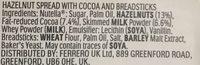 Ingredients: Sugar Palm Oil, HAZELNUTS (13%), Fat-reduced Cocoa (7.4%), skimmed MILK Powder (6.6%), Whey Powder (MILK) Emulsifier: Lecithin (SOYA) Vanillin. Breadsticks: WHEAT flour, Palm Oil sait Malt Extract, Baker's Yeast.