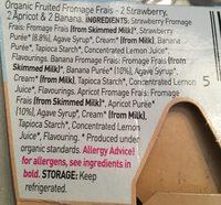 Ingredients: Strawberry Fromage Frais: Fromage Frais (from Skimmed Strawberry Purée* (8.8%), Agave Syrup*, Cream* (from Milk), Banana Purée*, Tapioca Starch*, Concentrated Lemon Juice*, Flavourings. Banana Fromage Frais: Fromage Frais (from Skimmed Banana Purée* (10%), Agave Syrup* 5 Cream* (from Milk), Tapioca Starch*, Concentrated Lemon Juice*, Flavourings. Apricot Fromage FralS?. Fromage Frais (from Skimmed Milk)*, Apricot Purée* (10%), Agave Syrup*, Cream* (from Milk), Tapioca Starch* Concentrated Lemon Juice*, Flavouring. * Produced under organic standards. Allergy Advice! forallergens, see ingredientsin t/ bold. STORAGE: Keep refrigerated.