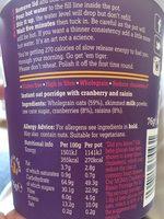 Ingredients: Wholegrain oats (59%), skimmed milk powder, raw cane sugar, cranberries (8%), raisins (8%). Allergy Advice: For allergens see ingredients in bold. May also contain nuts, Suitable for vegetarians. Nutritionalinfo Per 100g Per pot *Did you know? Oat