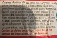 Ingredients: Cougnou - Farine de blé, eau, levure, huiles végétales (navette palme, tournesol), dextrose, graisse de palme, sucre inverti, décoration en sucre (sucre, eau, sirop de glucose blancs (au sol), sirop de glucose-fructose, arômes, colorant (E120) gluten de blé, lactosérum en poudre (contient du lait) 1,6%, sucre. sel iodé, émulsifiants (E471 E482, E472e, E322 (contient du soja)). protéines végétales (pois. pomme de tere), amidon, agents de traitement de la farine (E300, E920), extrait de Curcuma, arômes, sirop de glucose, jus de citron, maltodextrine, Contient du gluten, des œufs et du lait. Peut contenir des traces de moutarde et de sésame.
