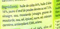 Ingredients: Huile de colza 64%, huile d'olive 16%, jaunes d'oeuf de poules élevées au sol 7,5%, vinaigre, eau, moutarde (vinaigre, graines de moutarde,eau, sel, épices) sucre, sel, colorant carotène, antioxydant E385, arôme
