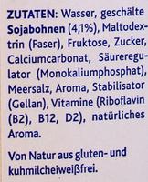 Ingredients: Wasser, geschälte Sojabohnen (4,1%), Matodextrin (Faser), Fruktose, Zucker, Calciumcarbonat, Säureregulator (Monokaliumphosphat), Meersalz, Aroma, Stabilisator (Gellan), Vitamine (Riboflavin (B2), B12, D2), natürliches Aroma