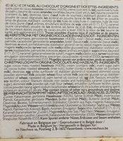 Ingredients: sucre, pâte de cacao, noisettes torréfées (4.83%), crème (con ient du lait), sucre inverti, huile de palme, beurre de cacao, amandes torréfées,beurre (cont 2nt du lait), beurre concentré (contient du lait), dextrose, blanc d'oeuf, huile de tournesc i, stabilisant glycérol de coiza, poudre de cacao dégraissée, lait écrémé en poudre, farine de blé, lait entier en poudre; sirop de glucose, stabilisant : sotbitol de blé, huile de colza, huile d : palmiste, huile de noix de coco, jaune d'œuf, arômes, émulsifiant lécithine de soja, colorant E 1 7 1 , E 1 72, caramel (sucre caramélisé), poudre de lait écrémé, sel, farine de rr att (E é), émulsifiant lécithine de toumesol, épices, poudre de cacao, poudre à lever: E50 )ii, nidon de blé, beurre de karité, anti-awlomérant E555. Traces possibles d'autres nocx, d' trachides et de sésame. @KERSTSfiONK MET ORIGINECHOCOLADE EN HAZELNOOT- INGREDIENTEN: suiker, cacaomassa, geroosterde hazelnoten (4.83%), roor bevat melk), invertsuiker, palmolie, cacaoboter, geroosterde amandelen, boter (6evat r Ìe k) , boterolie (bevat melk), dextrose, ei-eiwit, zonnebloemolie, stabilisator: glycerol van kc olzaad, magere cacaopoeder, magere melkpoeder, tarwemeet, volle melkpoeder, glucosesttoop, stabilisator: sorbitol van tarwe, koolzaadolie, palmpitolie, kokosolie, eigeel, aroma's, emulgat( sojalecithine, kleurstof: E 1 7 1 , E 1 72, karamel (gekarameliseerde suiker), magere mellooed 2t-,zout, tanMemoutmeel, emulgator: zonnebloemlecithine,s ecerïen, cacaopoeder, rii.çmidc el: E500ii, tarwezetmeel, sheaboter,antiklontermiddel: E555.P1 ed?kss ren van andere noten, inda en sesam.@ CHRISTMAS LOGWITH AND HAZELN&S-INGREDIENTS: sugar, cocoa mass, roasted hazelnuts (4.83%), cream (contains :nilk), invert sugar, palm oil, cocoa butter; roasted almonds (tree nuts), buter (conta;ns milk), butter oil (contans milk), dextrose, eg White, sunflower oil, stabilizer: glycerol Q f ra )eseed, skimmed cocoa powder, skimmed milk powder, wheat-flour, whole milk pov dei glucose syrup, stabilizer: sorbitol of wheat, rapeseed oil, palm kernel oil, coconut oil, yolk flavours, emulsifier: soy lecithin, colour: titanium dioxide, iron oxides and hydro 'des, caramel (caramelized sugar), skimmed milk powder, sait, malt flour (wheat), emulsifer: ;unflower lecithin, spices, cocoa powder, raising agent sodium bicarbonate, wheatstarch, butter, anticaking agent potassium aluminium silicate. Ma contain traces of other nuos, oundnuts and sesame. @WEIHNACHTSSTAMM MITYHERKUNFTSSCHOKOLAD : 'ASELNUSS-ZUTATEN: Zucker, Kakaomasse, gerôstete Haselnüsse (4.83%), Sahne (enthàtt Milch), Invertzucket; Palmôl, Kakaobuter, gerôstete Mandein, Butter (enthàtt Milch), Butterôl (enthâlt Milch), Dextrose, Eiweiss, Sonnenblumenôl, Stabilisator: Clycerin aus Raps, ma&eres Kakaopulver, Magemilchpulver, Weizenmehl,Vollmilc,hpulver,Glukosesirup, Stibilisator: soOit aus Weizen, Rapsôl, Palmkernôl, Kokosôl, Eigelb, Aromen, Emulgator: Soialezithin, Farbstoff E 1 7 1 , E 1 72, Kararnell (karamelisierter Zucker), Magetmilchpulver, Salz Malz Mehl (Weizen), Emulgator: Sonnenblumen-Lecithin, Gewürze, Kakaopulver, Backtriebmitte : E50011, Weizenstàrkemehl, Sheabutter Rieselhilfe: E555. Kann Spuren anderer Nüsse, Erdl lüsse und Sesam enthalten. Fabriqué en Belgique par / Geproduceerd in België door I Made in Belgtum by / HerRestellt in Belgien für: nv Neuhaus sa, Postweg 2, B- 1602Vlezenbeek. www.neuhaus.be