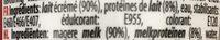 Ingredients: lait écrémé (90%), protéines de lait,stabilisant e460/e466/e407 , édulcorant e955, colorant e120