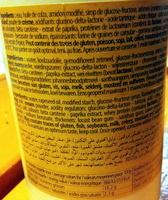 Ingredients: eau, huile de colza, amidon modifié, sirop de glucose-fructose, arôme (contient du lactose), vinaigre, jaune d'oeuf, poudre de crème, acidifiants:glucono-delta-lactone-acide tartrique-acide citrique-acide lactique, extrait de levure, sel, colorants:beta carotène - extrait de paprika, protéines de lactosérum (contient du lactose), conservateur: sorbate de potassium - benzoate de sodium, épaississants: farine de graines de caroube-gomme xanthane, poudre d'oignons, poudre d'ail, extrait d'épice.