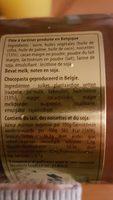 Ingredients: Pâte tartiner produite en Belgique Ingredtent$ sucre, huttes veqétates (hUtle de colza, huile de palme, huile de coco), noisettes (1396), cacao maigre en poudre, poudre du latt maigre, lactoserum en poudre (lait), farine de soja, emulstfiant : lécithine de soja Bevat melk, noten en soja, Chocopasta geproduceerd in Belgie. Ingredienten (raapolie: hatelnoten acaopoed€;c magot melkpoeder, weipoedet, *0jabloem, Contien€du lait, des noisettes et du soja, Valeur nutritive moyenne pat 100q/Gemiddelde voedingswaarde per 1009 561 Grais',es/Vette9 dont acides satutés/wòàtvan venadft)de kvètzyten 6, àg, de .V0ir db