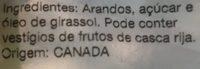 Ingredients: Ingredientes: Arandos, açücar e 61eo de girassol. Pode conter vestigios de frutos de casca rija. Origem: CANADA